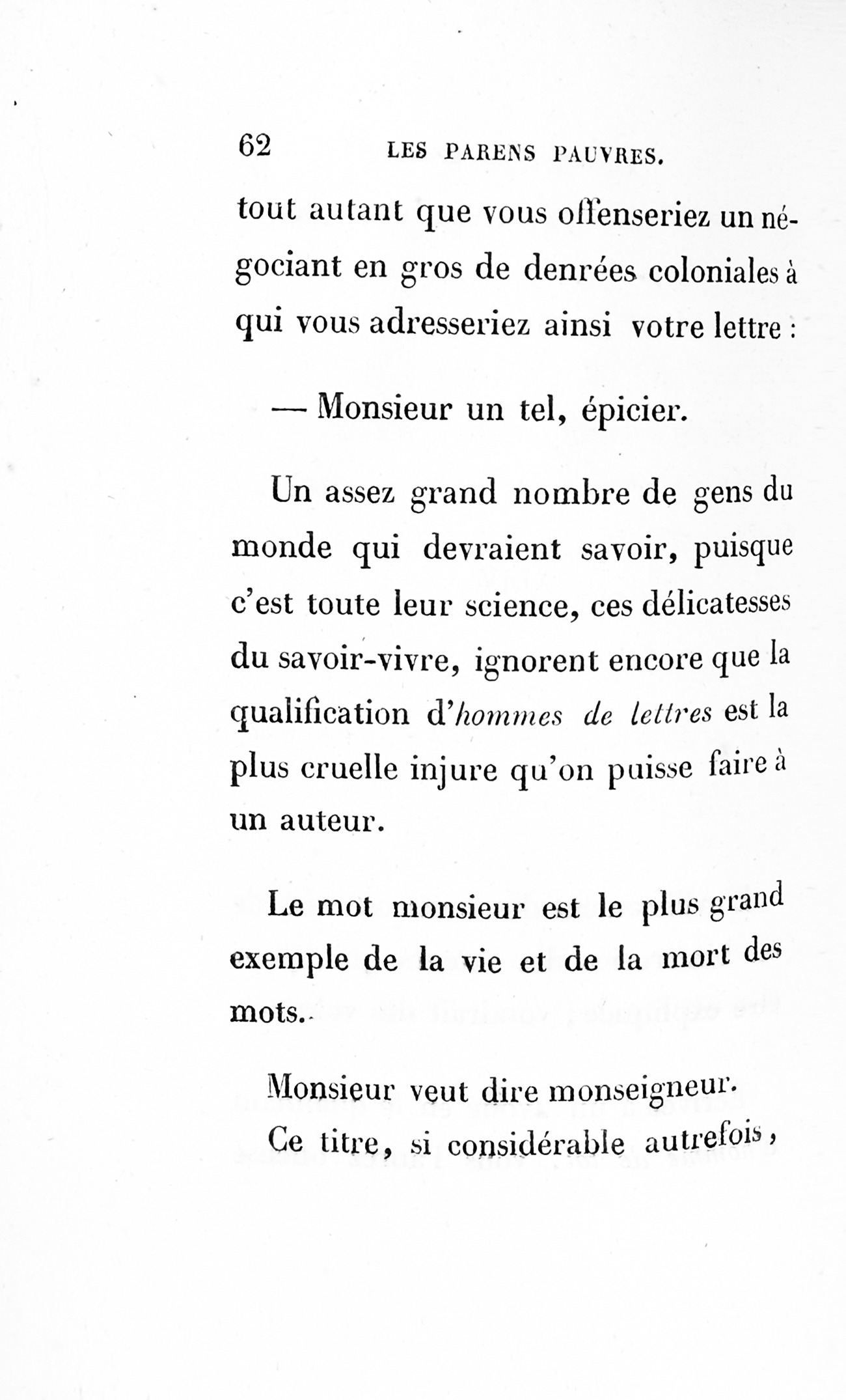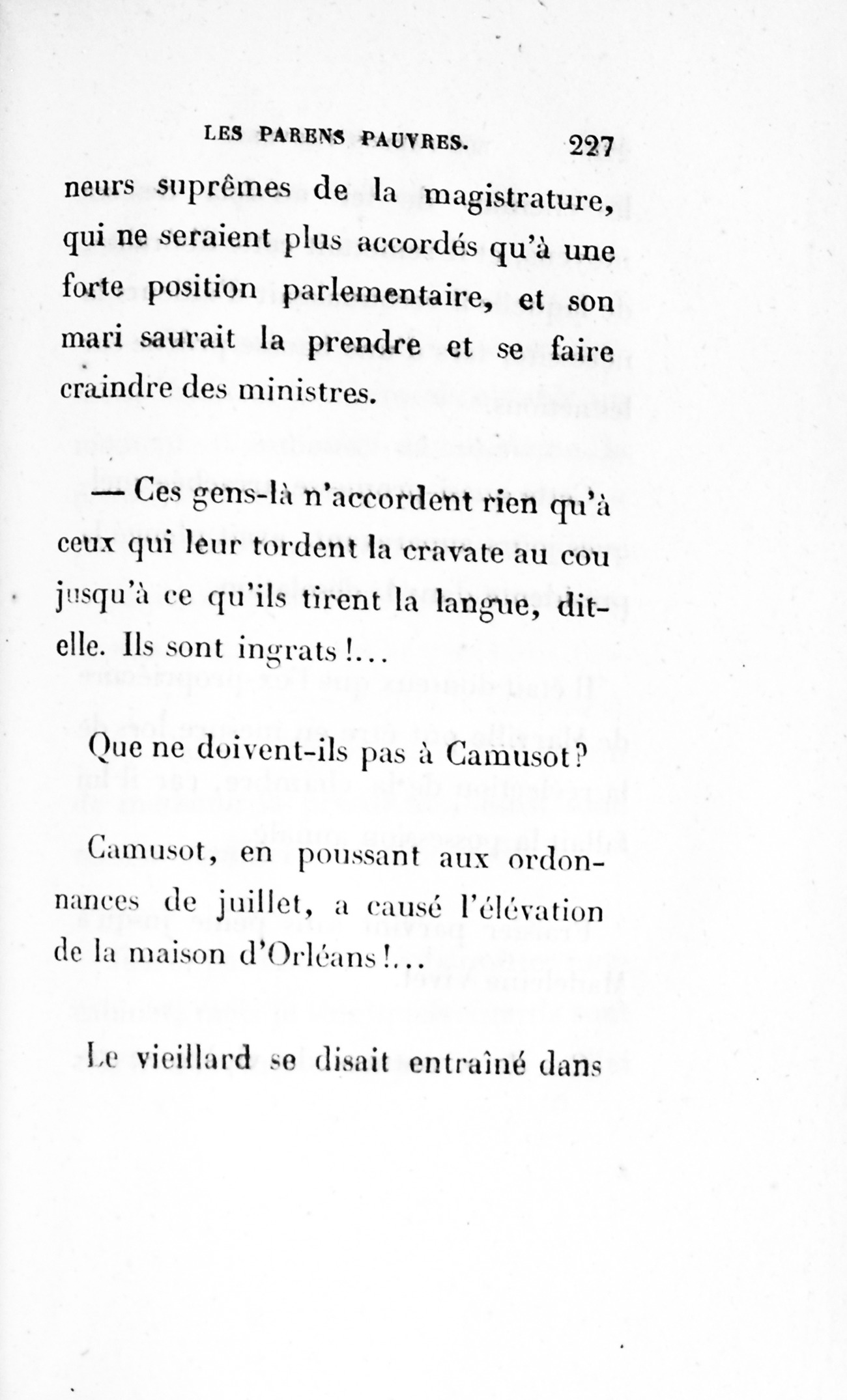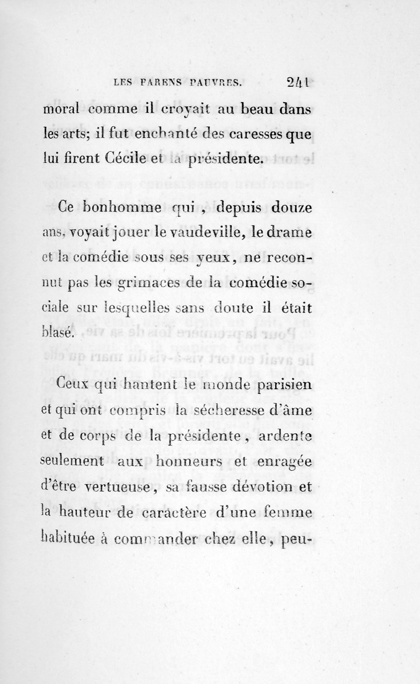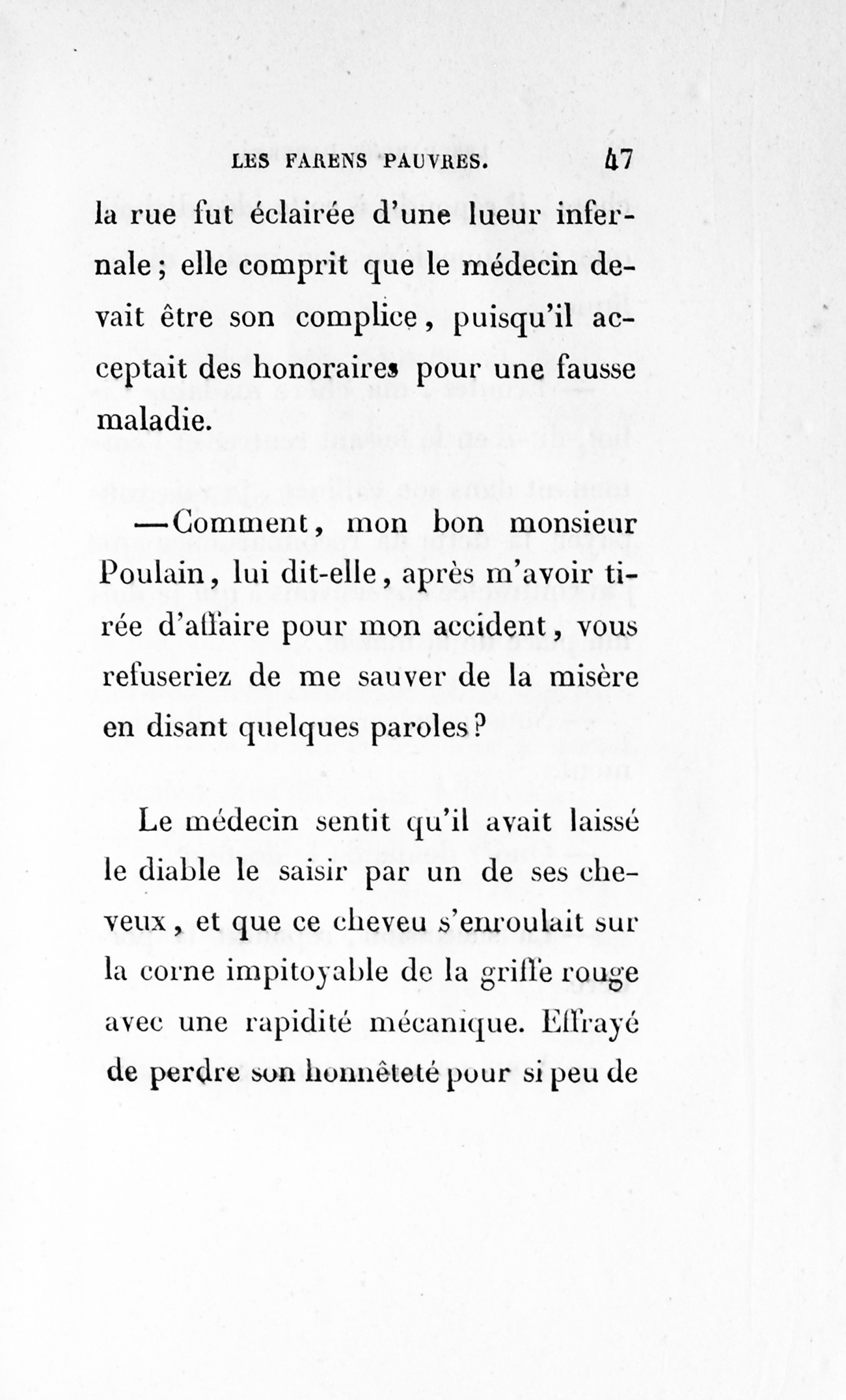 Cette fin, digne de ce scélérat, prouve en faveur de la Providence, que les peintres de mœurs sont accusés d’oublier, peut-être à cause des dénoûments p. 170 de drames qui en abusent.
