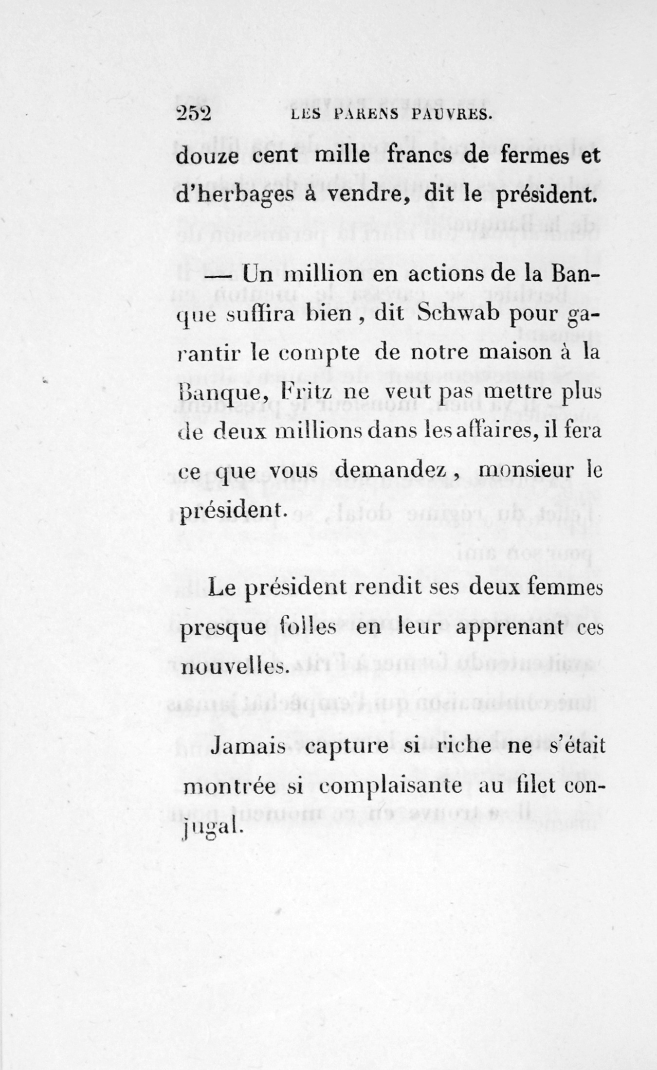 Tous les gens cupides comprendront autant que les gens honnêtes l’exécreront, la joie de la présidente à qui, p. 144 vingt minutes après le départ de Fraisier, Gaudissard vint apprendre sa conversation avec le pauvre Schmucke.
