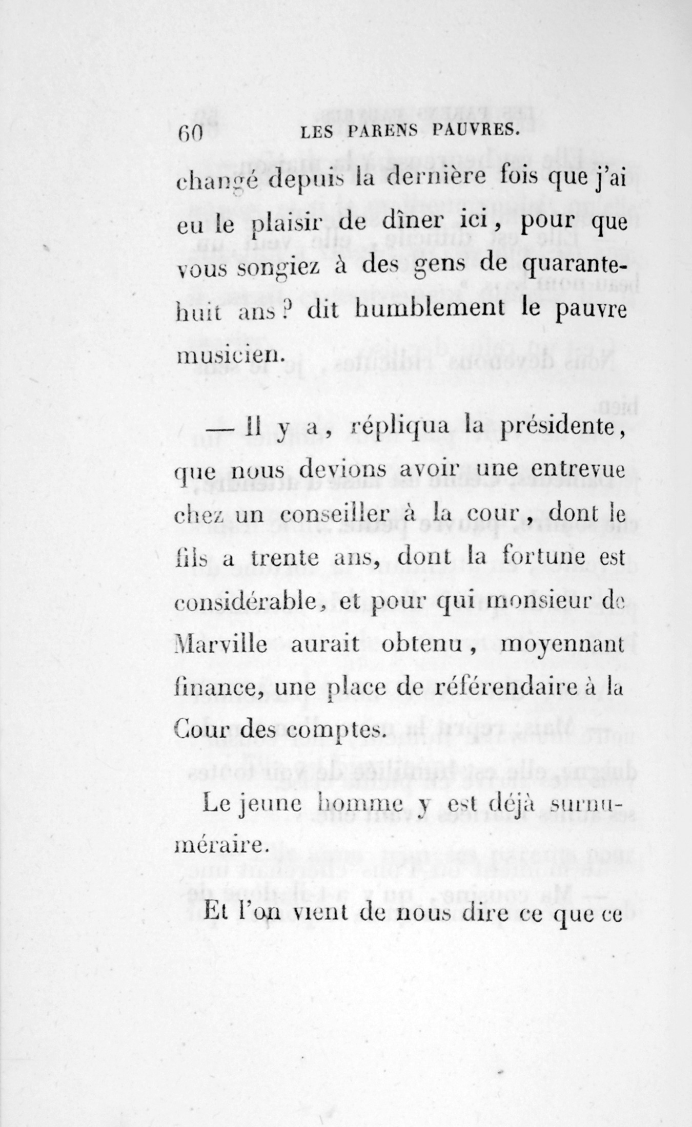 Fraisier, nommé juge de paix, est très-intime dans la maison du président et très-apprécié par la présidente, qui n’a pas voulu lui voir épouserla fille à Tabareau; elle promet infiniment mieux p. 160 que cela à l’habile homme à qui, selon elle, elle doit non-seulement l’acquisition des prairies de Marville et le cottage, mais encore l’élection de monsieur le président, nommé député à la réélection générale de 1846.