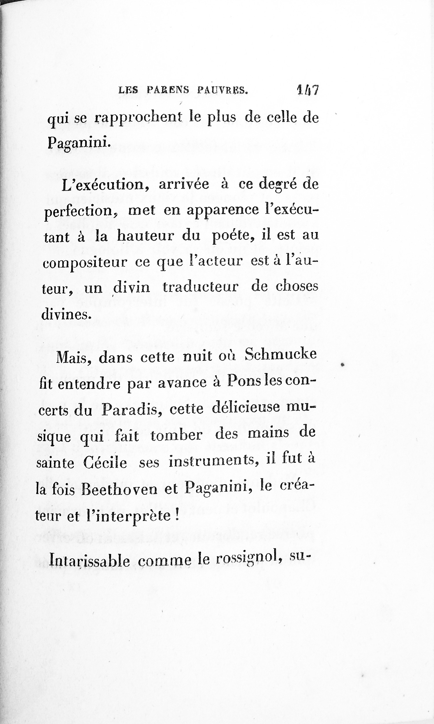 [p. 250] Ce bonhomme rendait d’ailleurs justice aux fameux maîtres de notre époque ; une belle exécution de quelques morceaux d’élite le faisait pleurer ; mais sa religion n’arrivait pas à ce point où elle frise la manie, comme chez les Kreisler d’Hoffmann ; il n’en laissait rien paraître, il jouissait en lui-même à la façon desHatchischinsou des Tériakis. Le génie de l’admiration, de la compréhension, la seule faculté par laquelle un homme ordinaire devient le frère d’un grand poète, est si rare à Paris, où toutes les idées ressemblent à des voyageurs passant dans une hôtellerie, que l’on doit accorder à Pons une respectueuse estime.