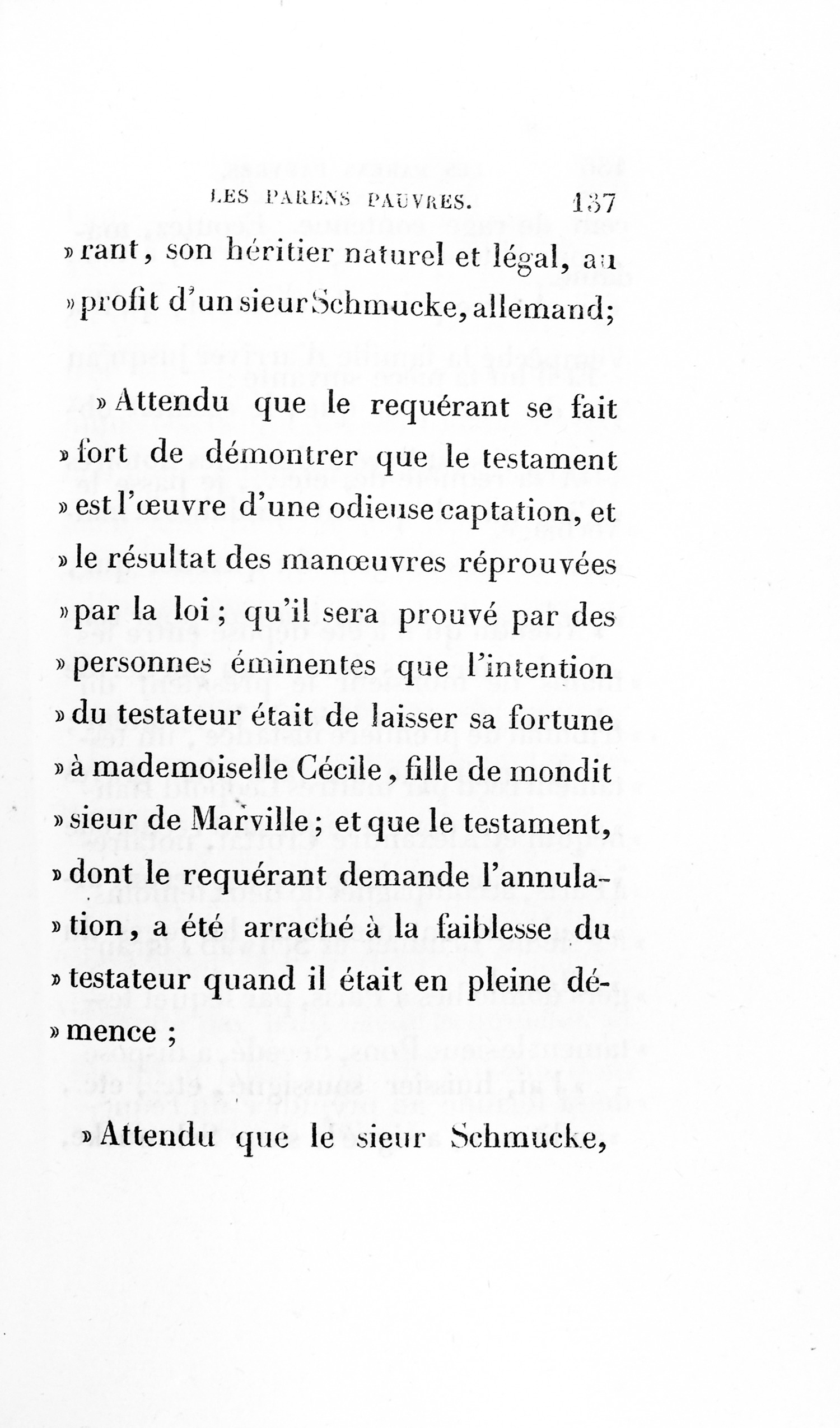 Attendu qu’il a été déposé entre les mains de monsieur le président du tribunal de première instance, un testament reçu par maîtres Léopold Hannequin et Alexandre Crottat, notaires à Paris, accompagnés de deux témoins, les sieurs Brunner et Schwab, étrangers domiciliés à Paris, par lequel testament le sieur Pons, décédé, a disposé de sa fortune au préjudice du requérant, p. 137 son héritier naturel et légal, au profit d’un sieur Schmucke, allemand ;